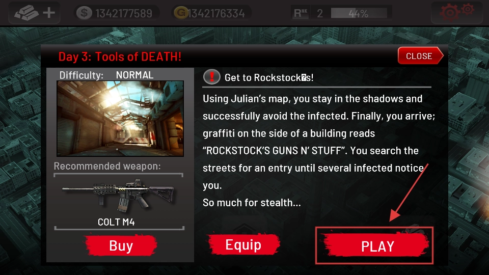在接取【Day-3】任务之后,点击【PLAY】按钮进入战斗场景。如果潜行尝试未能成功,就需要使用武器击退那些围拢过来的感染者。