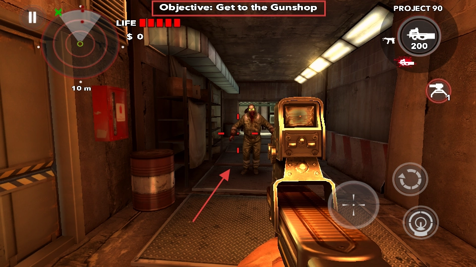 对准前方的丧尸进行射击,运用武器的火力来扫清障碍,依照【Objective-GettotheGunshop】的指引移动,注意维持血量。