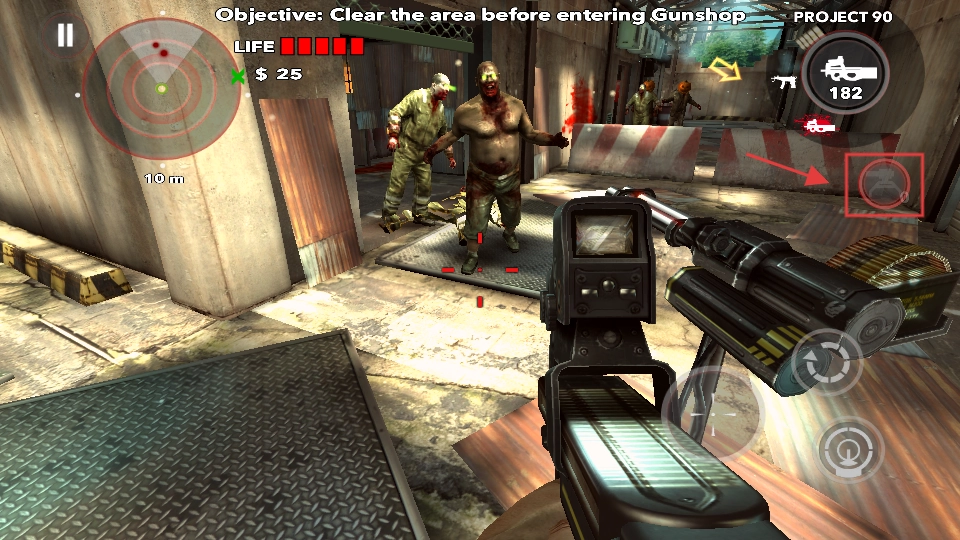 优先攻击胖丧尸这类强力敌人,点击道具图标就能释放群攻道具,在清空【Objective-CleartheareabeforeenteringGunshop】区域后即可进入枪店。