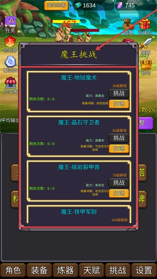 在【魔王挑战】玩法里解锁对应等级的魔王,比如【地狱魔犬】这类,借助剩余的挑战次数去获取装备词缀的加成效果。