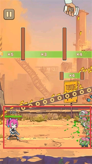 子弹落地后会顺着既定轨迹移动,碰到倍数区域就能累积增益效果,与此同时角色会主动攻击冒出来的僵尸。