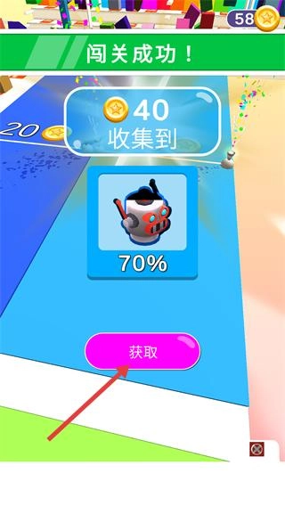闯关成功之后,点击【获取】按钮,就能领取到【40】个金币以及腿部解锁进度【70%】,通过积累这些资源来提升自身能力。