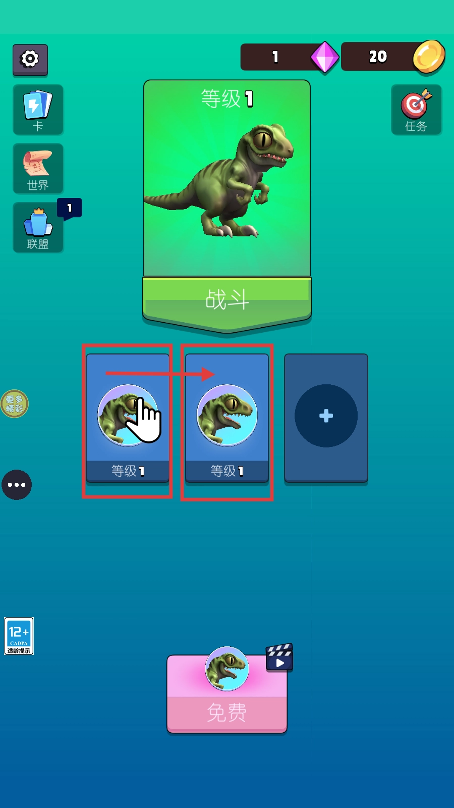 4、进入恐龙卡牌界面后,你可以拖动等级相同的恐龙卡牌进行合成操作,这样能帮助恐龙完成进化,让后续的战斗更具优势哦。