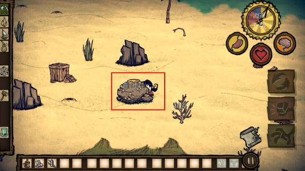 前往岩石、贝壳堆附近,通过挖掘来收集各类资源,不断充实物资储备,以此为后续的建造与生存活动做好前期准备。