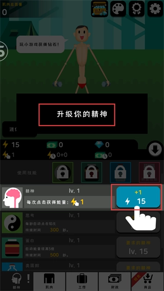 消耗能量后点击【+1】至【15】的按钮来升级精神属性,这样能提高每次点击获得的能量值,从而让肌肉的养成节奏变得更快。