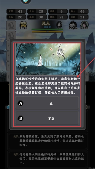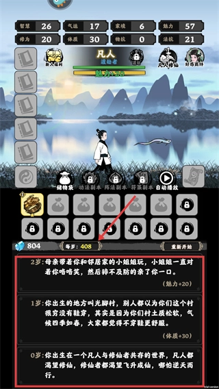 在主界面中,您可以通过查看事件日志来了解各项属性的变化情况;同时,借助储物袋能够妥善存放各类宝物;此外,通过参与功法副本还能积累修行所需的资源,从而提升自身的修为境界。