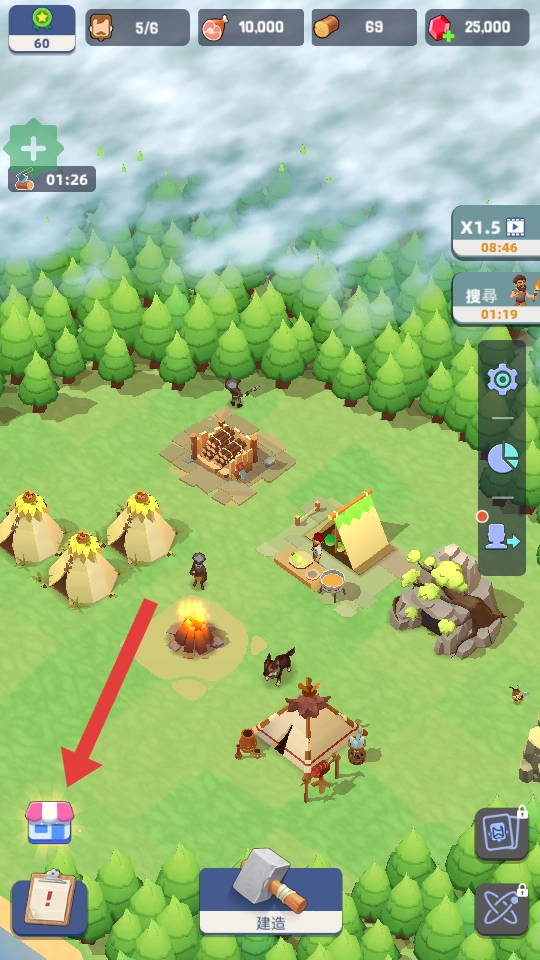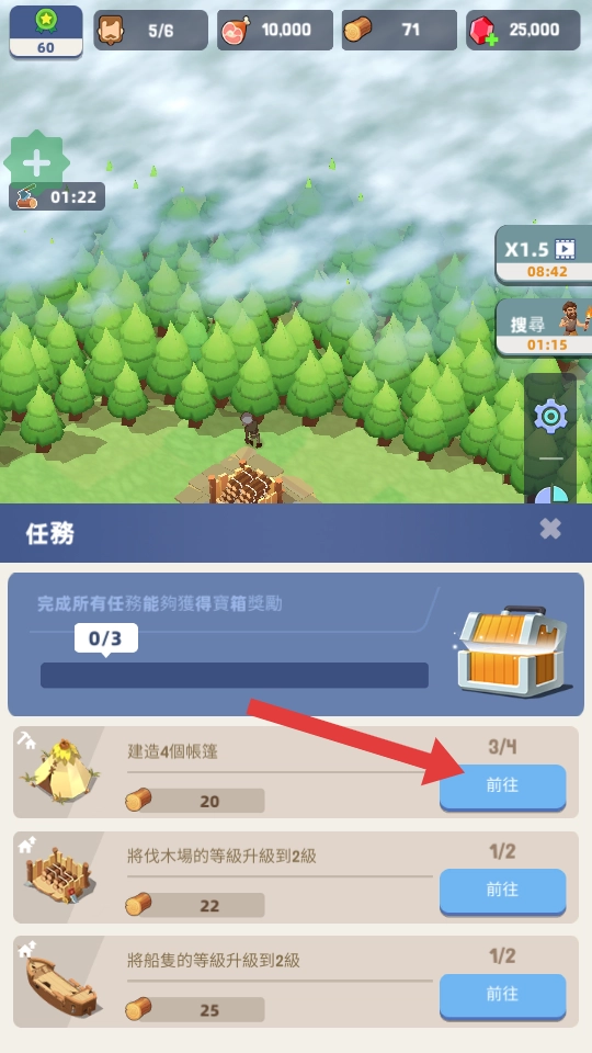 点击左侧的任务图标,就能查看当前的任务列表,从而知晓需要达成的目标,比如搭建帐篷、提升伐木场等级等。