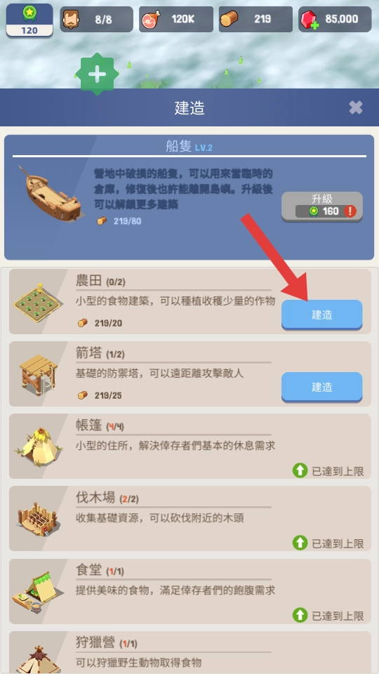 在建造界面里,挑选想要建造的建筑(比如农田),点击【建造】按钮,消耗对应的资源来完成建造。