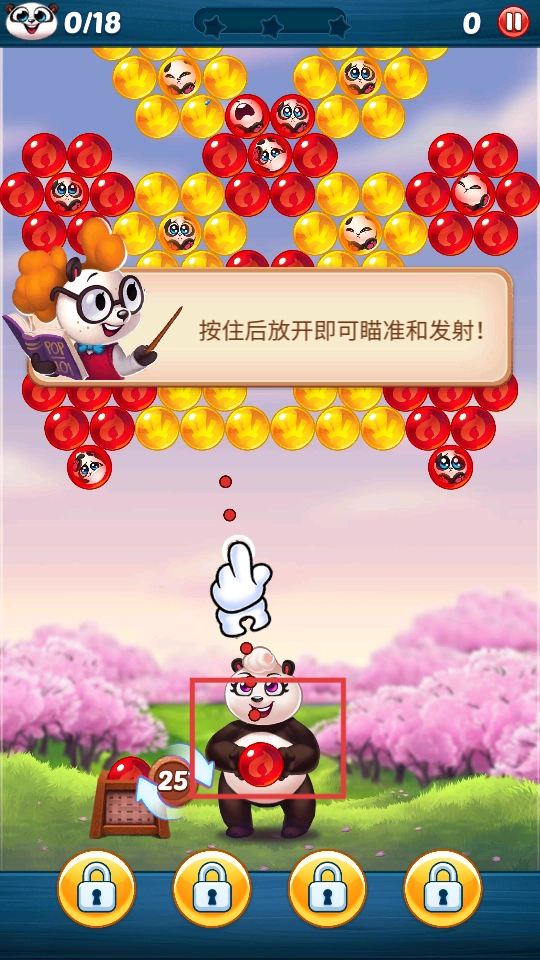 按住后松开即可进行瞄准和发射泡泡,消除相同颜色的泡泡,达成关卡目标。