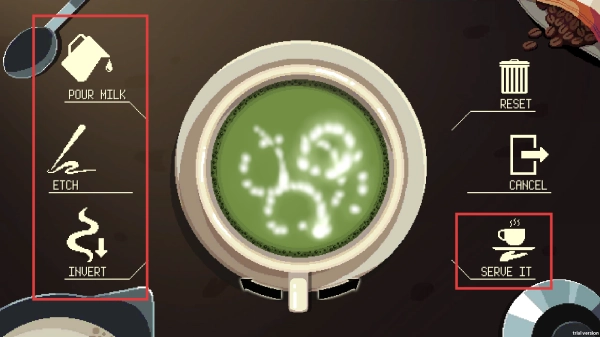 咖啡制作完成后,点击左侧按键开始进行拉花操作,最后点击【SERVEIT】按钮就能将咖啡端送给顾客了。
