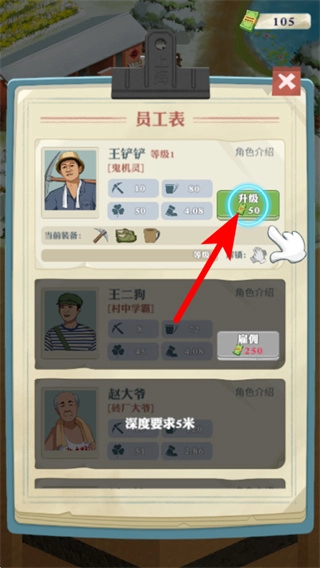 点击升级按钮会消耗50个道具等资源,用来提升员工王铲铲的挖掘力、耐力等属性,从而增强挖掘效率。