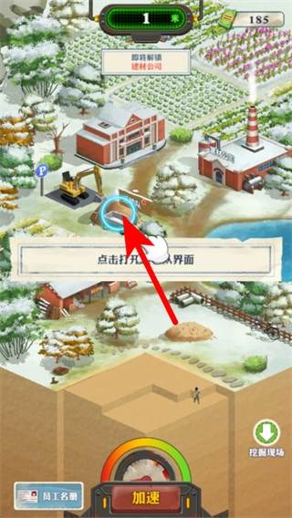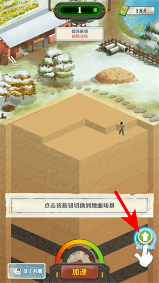 在挖掘场景里,点击向上按钮就能切换到地面场景,这样就能解锁地面的新功能,比如初级仓库,从而拓展更多玩法。