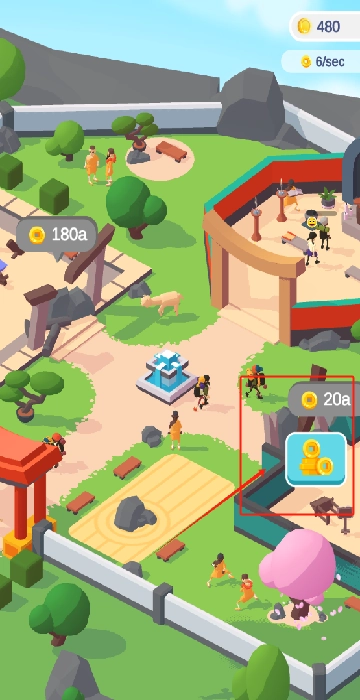 去园区里标记着180a和20a的位置收取金币,右上角显示当前拥有480个金币,每秒能赚取6个金币。
