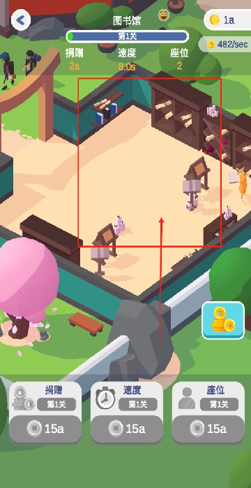 在图书馆里,点击底部的三个按钮就能升级设施,每个按钮对应花费15a金币,随着设施升级,来这里看书的人也变得越来越多了。