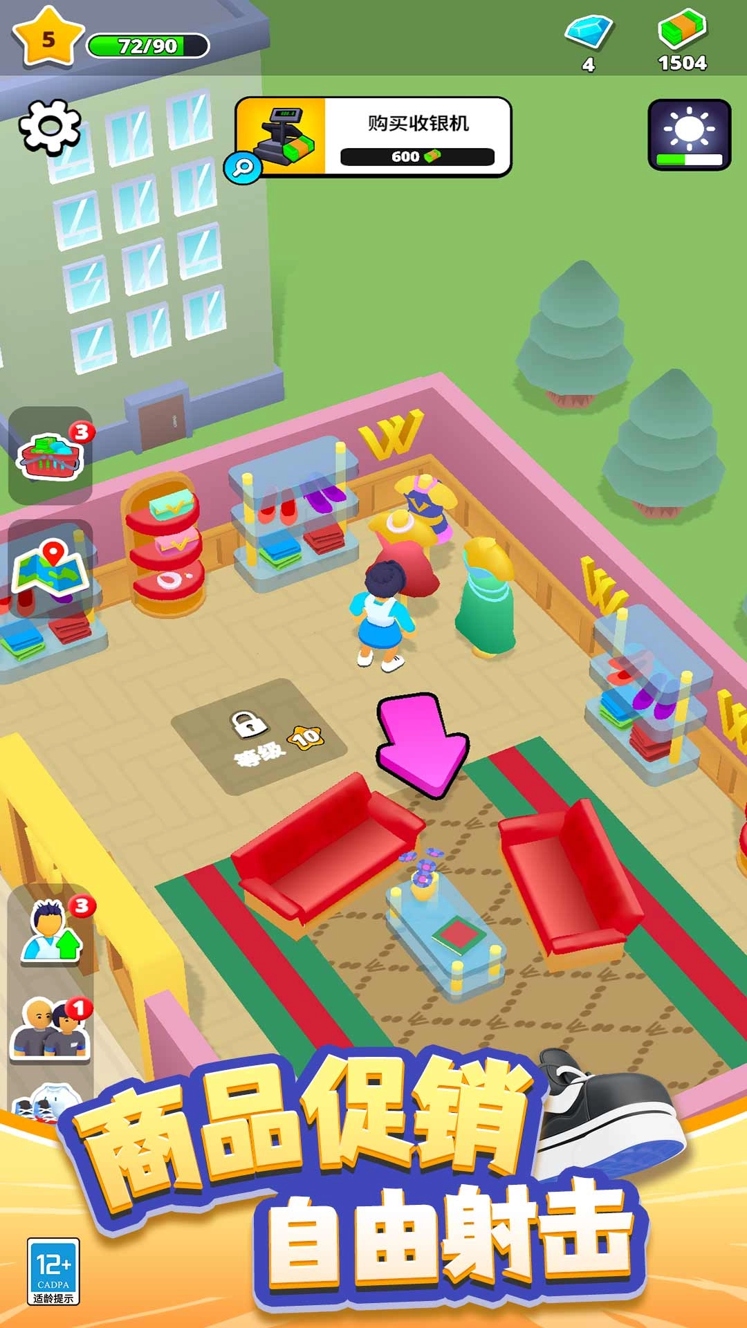 迷你时装城是一款十分有趣的模拟经营类游戏,玩家在游戏里能够打造出全新的时装商城。大家可以自由摆放服装生产设备,把制作完成的服装进行上架,让顾客们能够自由试穿和选购。玩家需要掌握经营的技巧,不断增加客人的数量,快速提高商城的收益,并且及时升级所有的设备,招募更多的员工,通过这些方式来管理商城。