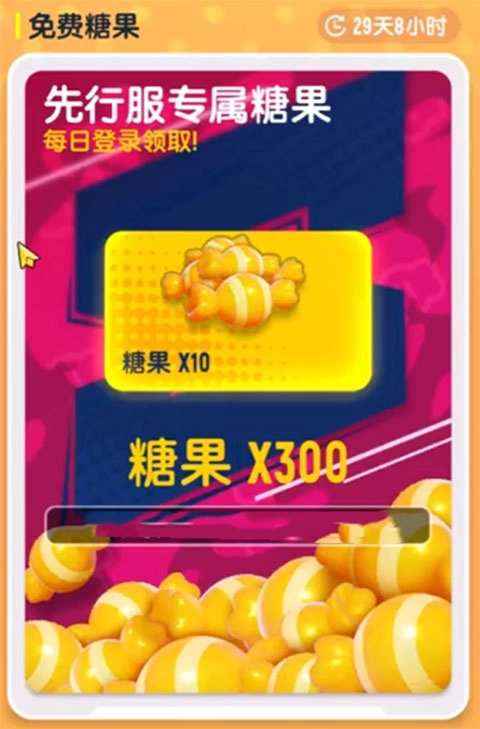 1、首先,先行服的每日奖励包含10颗糖果,该奖励可连续领取30天,累计可获得300颗糖果。