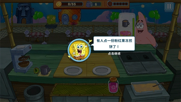 3、菜谱解锁机制:在游戏进程中,玩家能逐步解锁更多菜谱,以此扩充菜单的品类,从而更好地满足顾客多样化的需求。游戏采用了萌趣的画面风格,让玩家沉浸式体验海绵宝宝的欢乐世界。