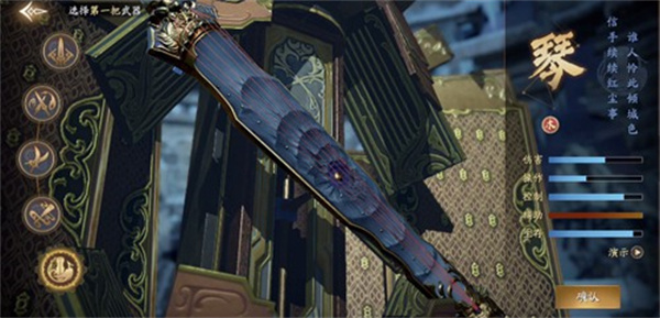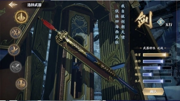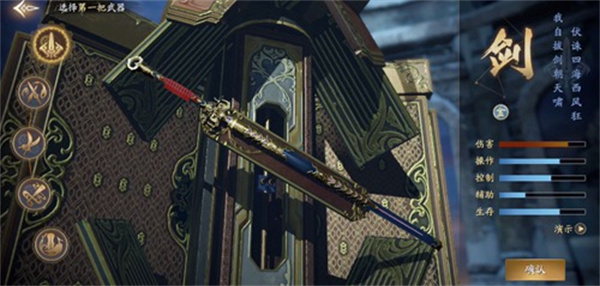 完成角色捏脸后,玩家可以在武器选择界面选择剑。剑伤害非常高,并且也有一定的生存能力,适合新手上路,剑的五行属性为金。