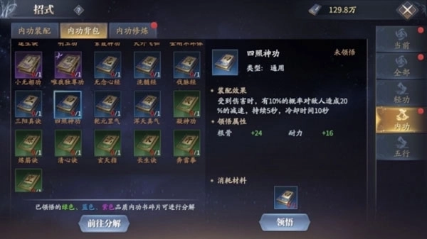 通用内功的话,小编建议可以装备《拈花指》增加命中率,选择《长生诀》增加对定身敌人的伤害,《清心诀》增加血量较低时的伤害,《三阳真决》提升对定身/封招/眩晕敌人的伤害,最后是《四照神功》,受到伤害时,有10%的几率对敌人造成20%的减速。