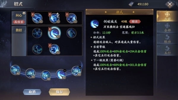 被动“剑意”:使用技能可增加剑意值,剑意值满后可以手动开启,一定时间内不点击也会自动释放。开启后进入凌云状态,增加自身30%的攻击力,同时技能【霜寒易水】、【剑斩风云】可触发五行效果。