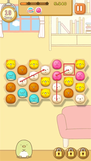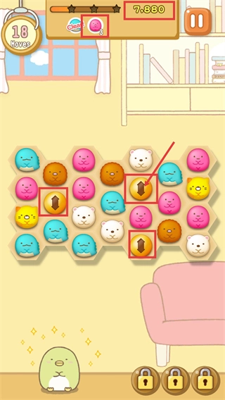 2、消除时关注顶部【Clear!-粉色蛋形-3】进度,优先匹配【白色小熊】类图案,可连带目标图案一起消除。