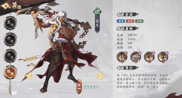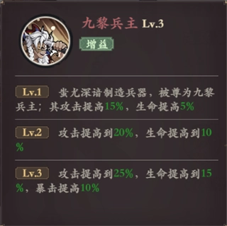 技能介绍:蚩尤精通兵器打造之术,被九黎部族尊为兵主;他的攻击属性提升15%,生命值提升5%