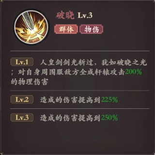 技能描述:人皇剑的剑光挥斩而出,恰似破晓时分的光芒;对自身周围的所有敌方单位造成相当于轩辕攻击200%的物理伤害