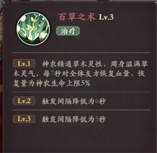技能描述:神农深谙草木灵性,周身萦绕着草木灵气,每7秒为全体友方恢复生命值,恢复量等同于神农生命上限的5%