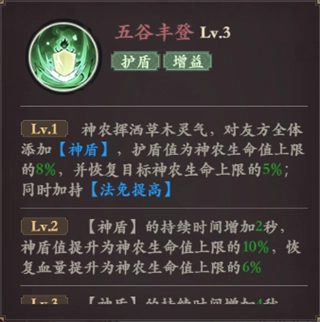 技能描述:神农挥洒草木灵气,对友方全体添加【神盾】,护盾值为神农生命值上限的8%,并恢复目标神农生命上限的5%;同时加持【法免提高】