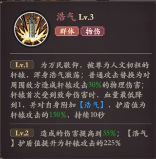 技能描述:身为受万民敬仰、被尊为人文初祖的轩辕,周身浩气澎湃;其普通攻击变为对周围敌人造成相当于自身攻击30%的物理伤害;当轩辕首次遭遇致命伤害时,血量会最低保留至1点,同时为自身附加【浩气】效果——获得数值等于自身攻击150%的护盾,该护盾持续10秒。