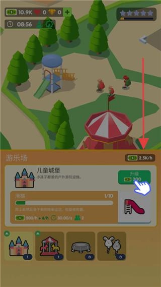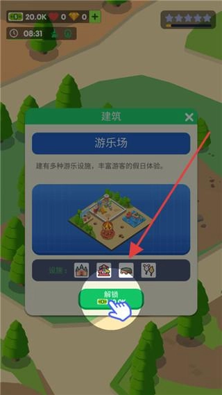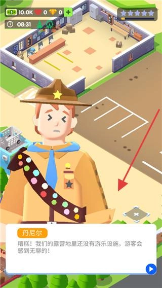 3、设施升级体系:从基础“简易帐篷”到豪华“星空木屋”,解锁“太阳能发电站”“露天影院”等进阶设施增加营收。