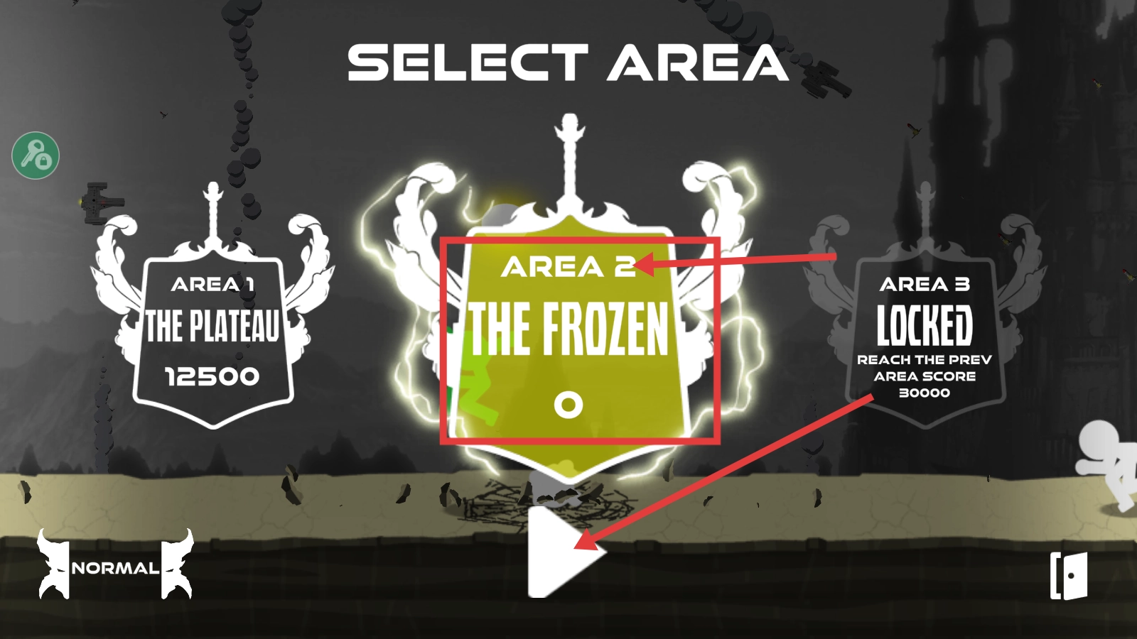 在【SELECT-AREA】界面选中【AREA2THEFROZEN】,点击播放键,就能开启冰雪区域的冒险之旅。