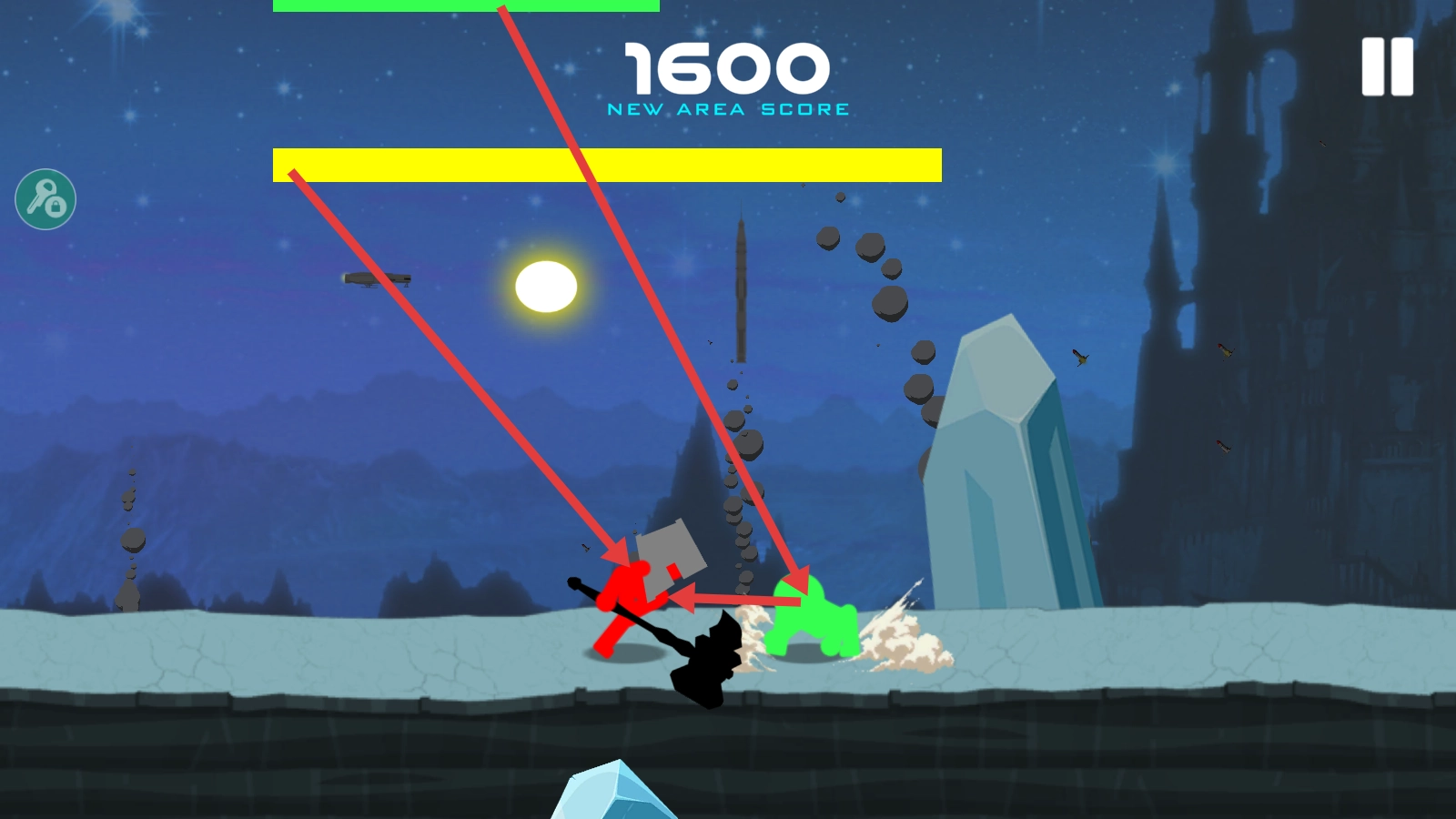 进入冰雪场景后,操控绿色角色攻击红色普通敌人,将区域得分积累到【1600】。
