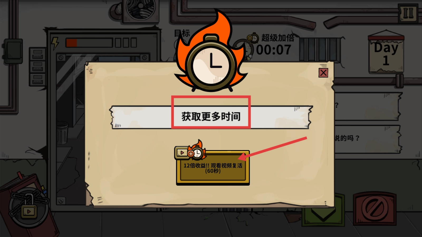 当时间用完,弹出【是否想要继续游戏?】的提示时,你可以选择免费复活或者观看视频复活来继续游戏。