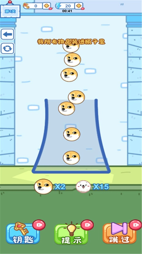 在这款游戏中,玩家需要想办法把瓶子里指定的所有狗头都装满才算成功。