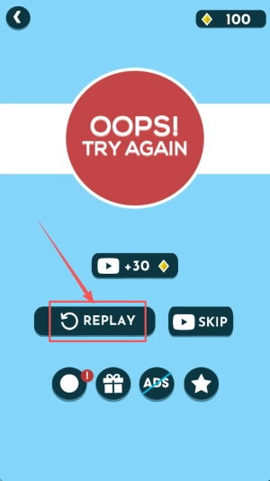 要是看到「OOPS! TRY AGAIN」的提示,你可以点击「1+30」来复活,或者选择「SKIP」直接跳过这一关。