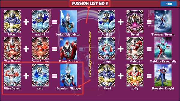 在【FUSION-LIST-NO-3】中,选取【Ultra-Seven】和【zero】这两张卡片进行组合,就能通过融合得到【Emerium-Slugger】形态。