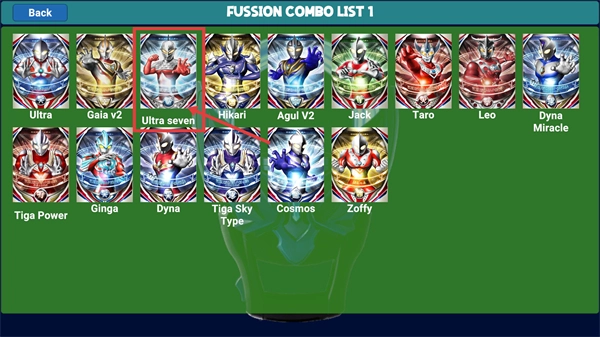 进入【FUSION-COMBO-LIST-1】界面,选中【Ultra-seven】卡片,把它当作融合流程的素材之一。