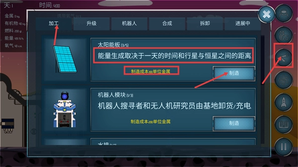 在【加工】界面里,制作【太阳能板(3/5)】要消耗【100单位金属】,它的能量产出会受到时间以及行星与恒星之间距离的影响,建议优先搭建来保障能源供应。