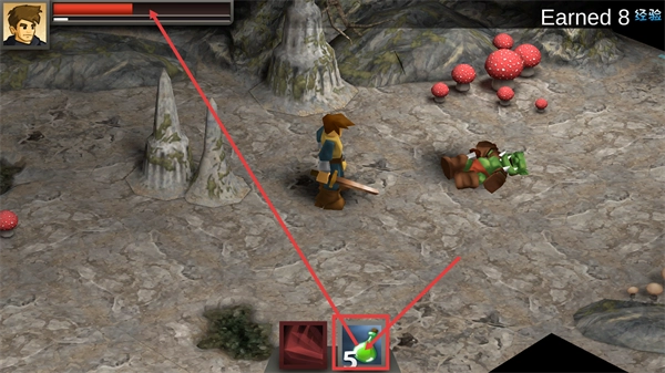 击败【哥布林】后,会获得【Earned-8-经验】来提升等级,还能借助道具恢复自身状态。