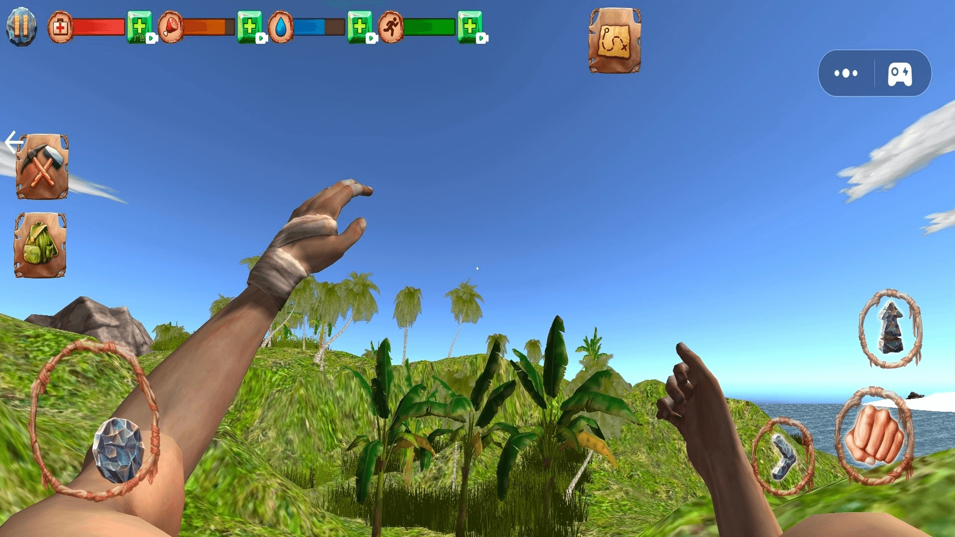 需要留意体力和饥渴值的变化,按时去采集果实、捕猎小型动物来补充消耗,以此保持能够生存的状态,好应对突然发生的战斗。
