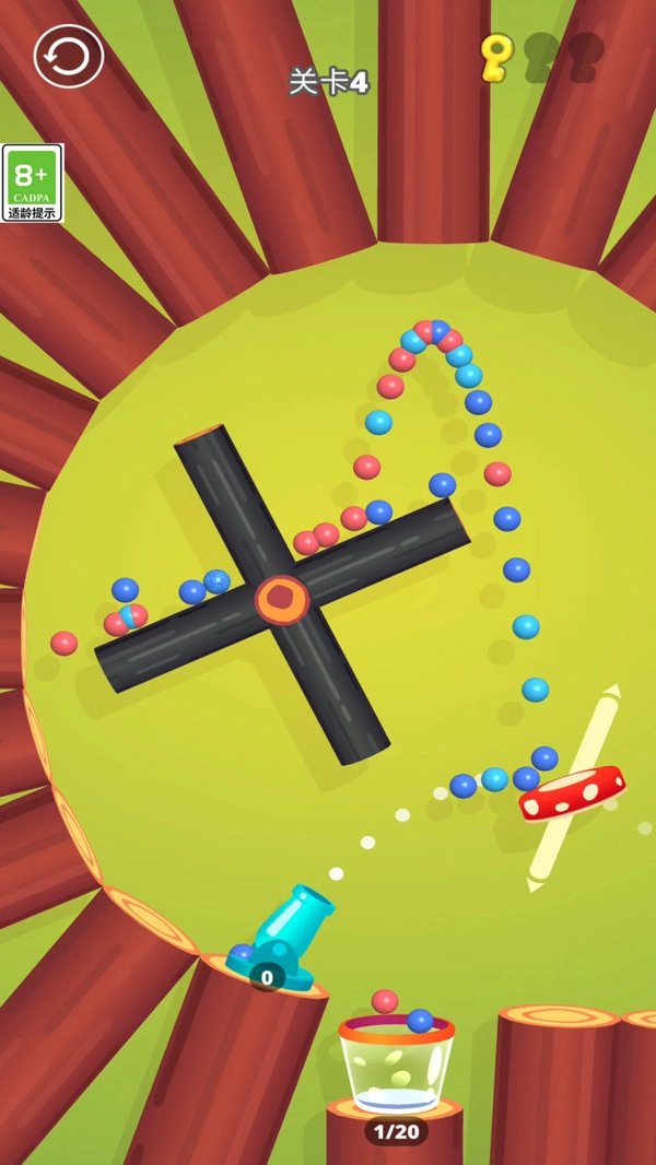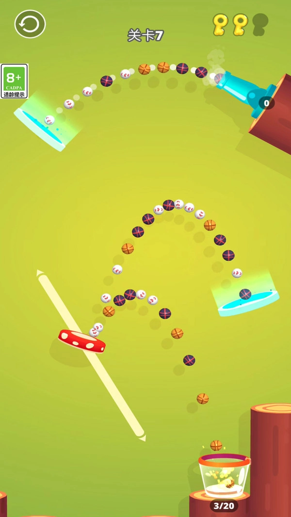 拖动场景里的挡板、道具这类物体来调整球的弹射轨迹,让大炮发射的球落入桶中,把桶装满就能通关。