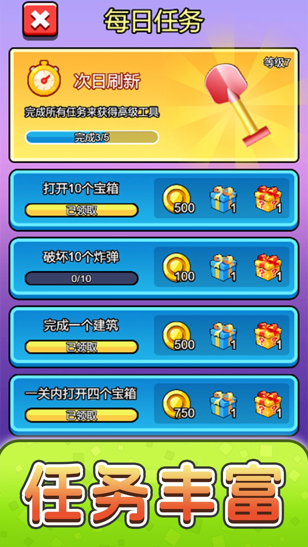 2、及时利用金币和资源升级铲子,优先提升挖掘速度与耐久度,同时制作探测仪等辅助道具。
