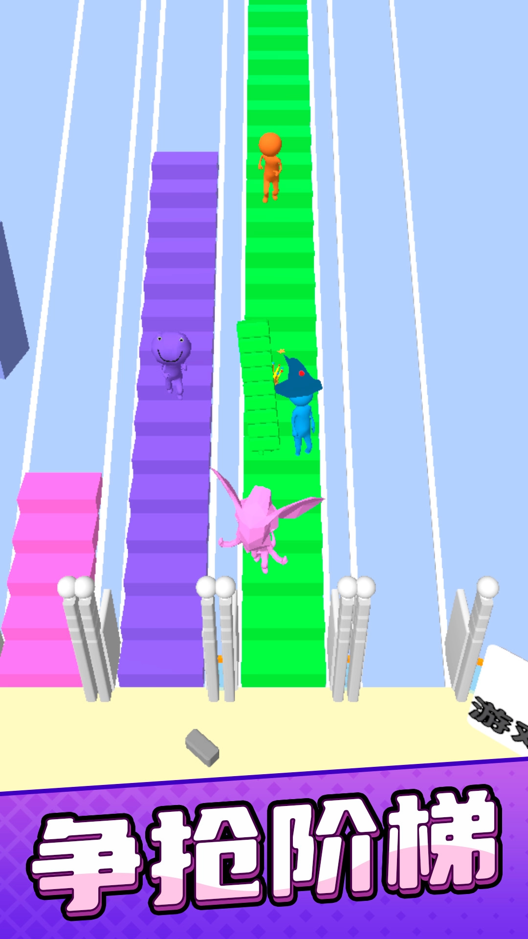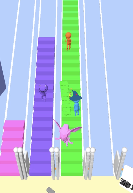 赛道上散落着各式各样的道具,胶水道具能够减慢对手搭建桥梁的速度,护盾道具则可以抵挡一次障碍物的攻击。