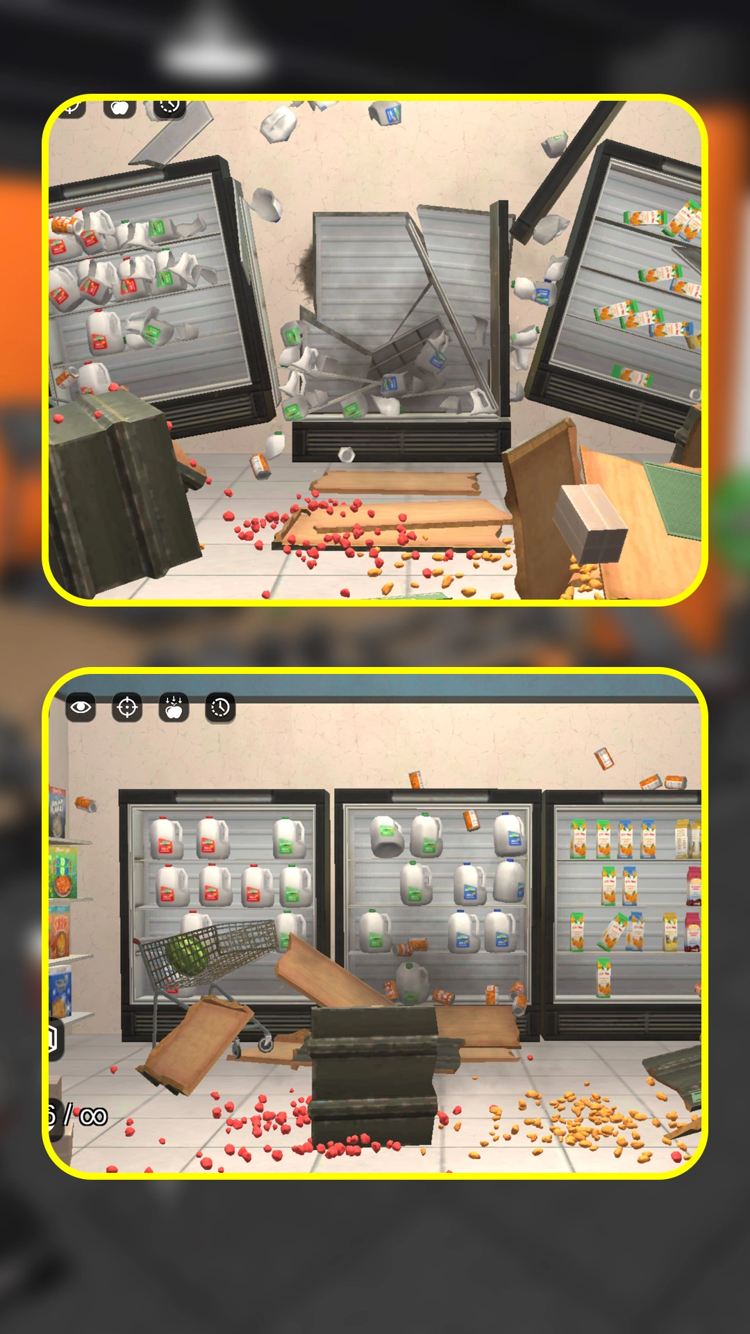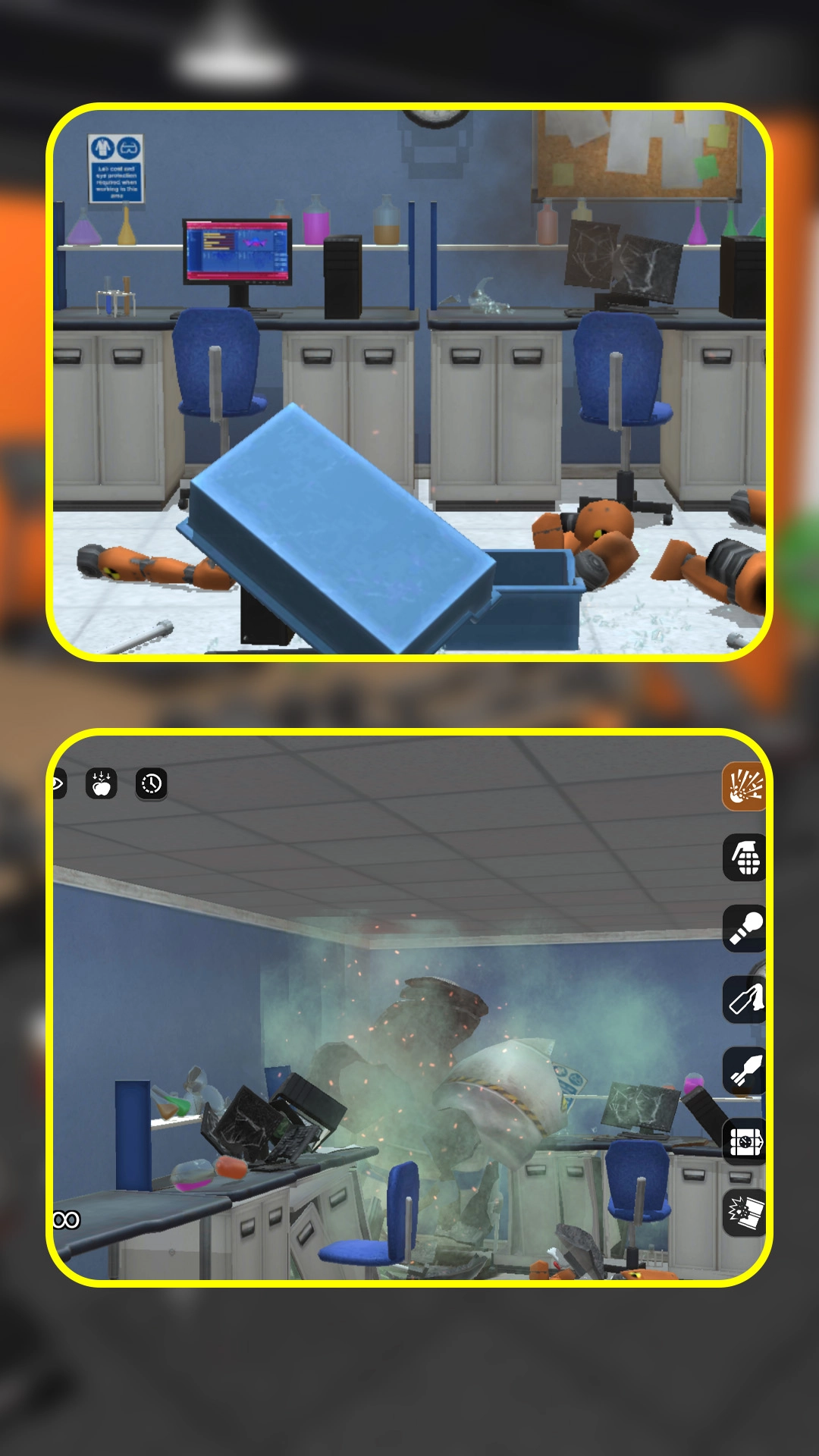 使用所选工具对场景里的环境、物品、机器人等展开破坏,还能发挥创意,自行设定破坏方式。