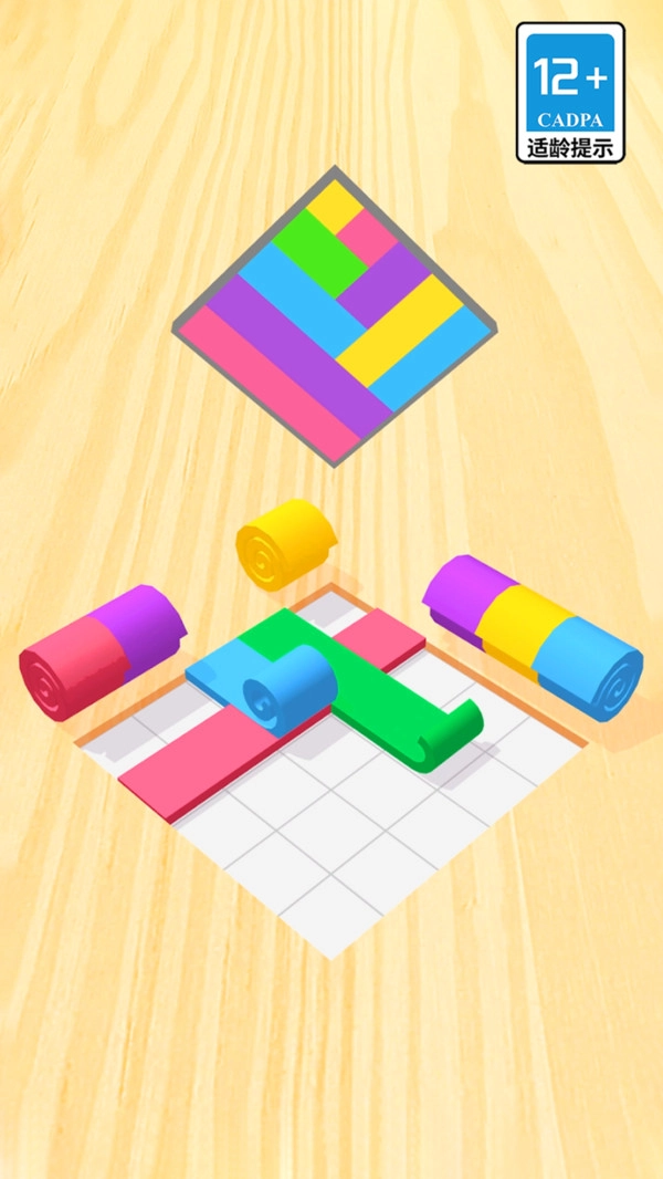 根据目标图案,移动并组合彩色卷状模块,拼出完整图形以完成任务。