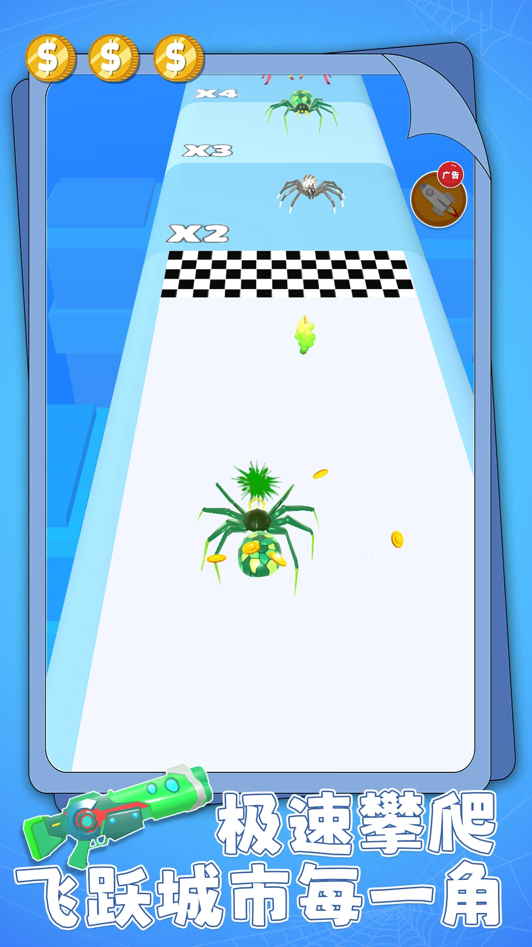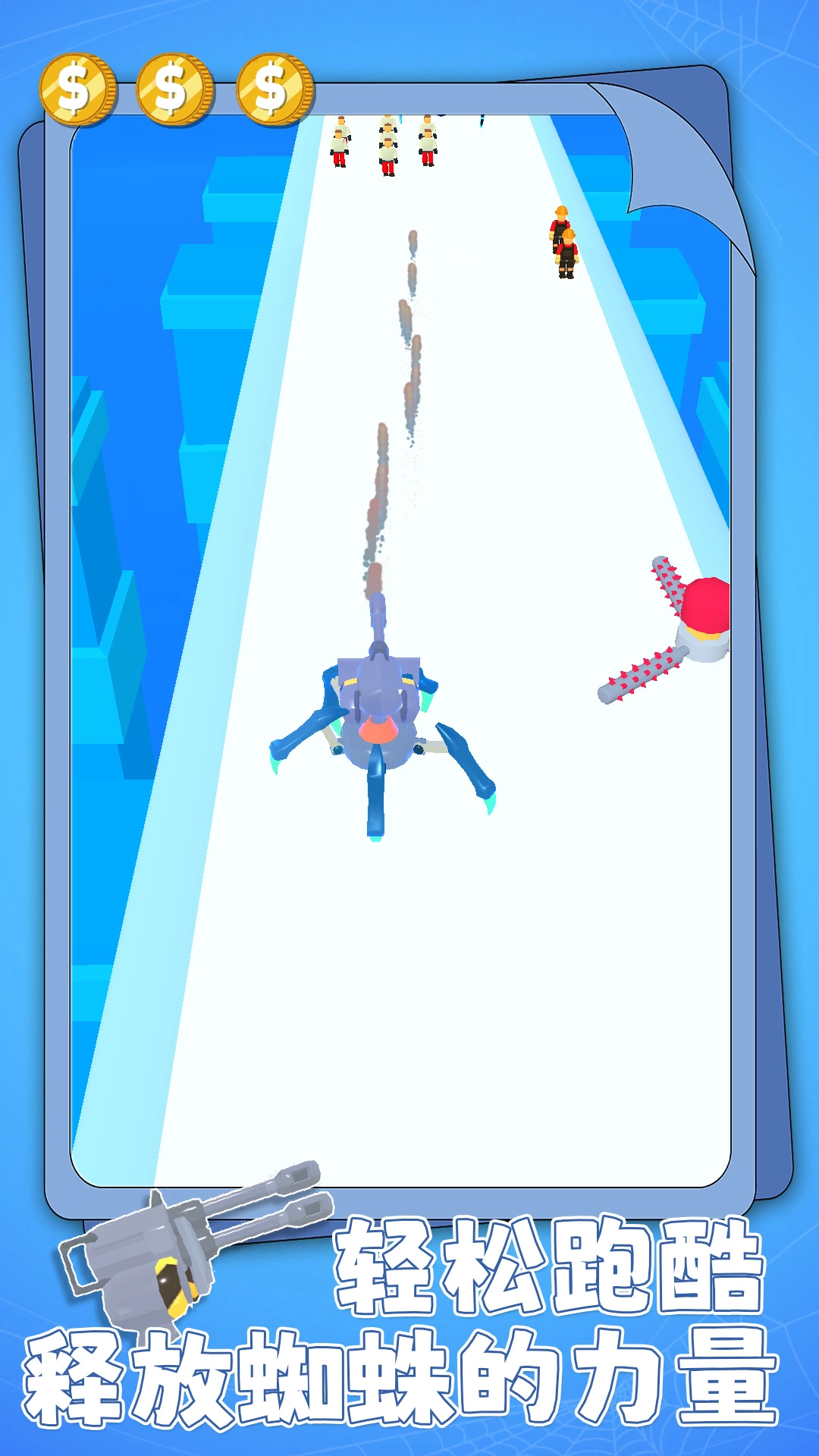 在跑酷过程中收集金币,这些金币可用于提升蜘蛛的等级和速度,还能在商店里解锁全新外观与强力道具。