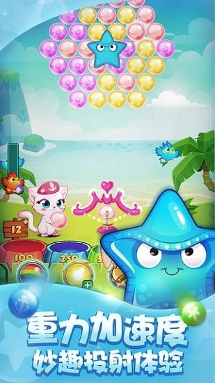 泡泡喵海岛历险是网易推出的创新体感泡泡龙消除类游戏。这是一款以消除泡泡为核心玩法的休闲游戏,玩家通过消除泡泡可以获取星星、解救伙伴并击败邪恶的章鱼怪。游戏操作方式独特,玩家只需倾斜手机就能控制泡泡的掉落方向,当泡泡落入中间的积分桶时,还有机会赢取免费的道具奖励。