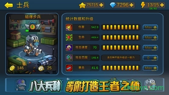 2、这里有8种具备不同技能的兵种,还有能力各异的僵尸,更有海量关卡等待你前来挑战。