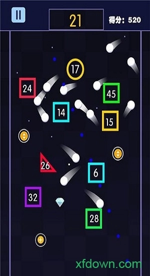 3、弹珠每击中一次方块就能得到分数,要在方块落到底端之前尽量获取更高的分数。